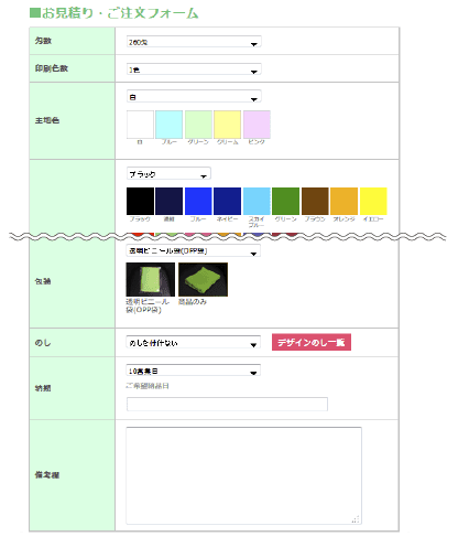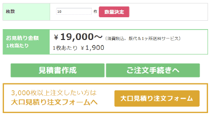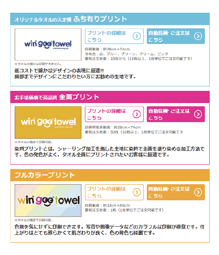タオルの種類、印刷方法を選んで詳細を入力、枚数を入れて数量決定ボタンを押すと自動でお見積り金額がでます。