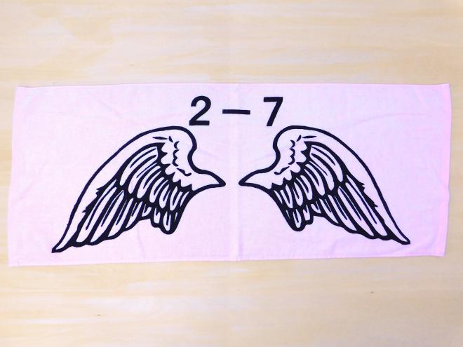 ピンクのフェイスタオルを生地として使用した、ふち有り(顔料)プリントのオリジナルタオルです。ブラックのインクでの印刷は生地色を選ばないのが特長です!とてもインパクトのある仕上がりになっております!
