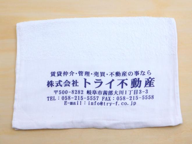 白のフェイスタオルを生地として使用した、名入れタオルです。根強い人気の濃紺での名入れ印刷です。濃紺インクでの印刷は生地色をほとんど選ばないのが特長です。