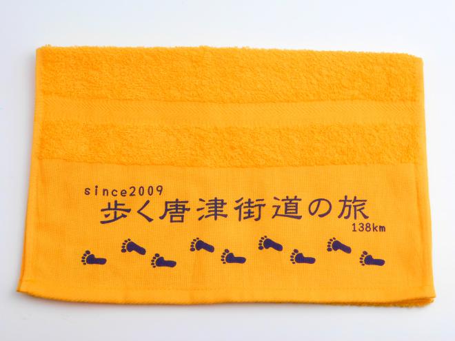 オレンジのフェイスタオルを生地として使用した、名入れタオルです。大人気のネイビーで名入れ印刷させていただきました。大阪泉州産の高品質タオルなのでふんわり柔らかです。