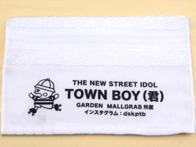 白のフェイスタオルを生地として使用した、名入れタオルです。ブラックのインクでの印刷は生地色を選ばないのが特長です。