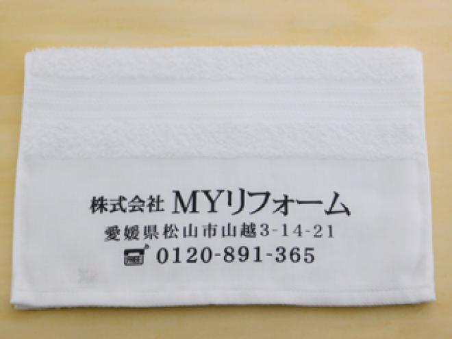 白のフェイスタオルを生地として使用した、名入れタオルです。ブラックのインクでの印刷は生地色を選ばないのが特長です。