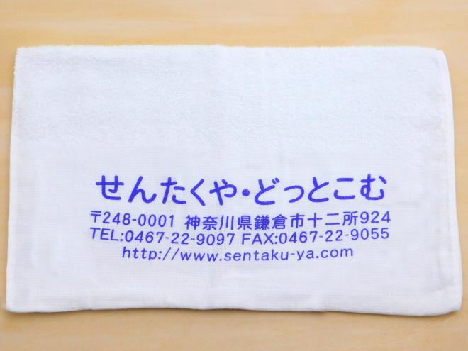白のフェイスタオルを生地として使用した、名入れタオルです。今回、4行タイプのレイアウトでお作りさせていただきました!白のタオル生地にネイビーでの印刷はとても人気です!