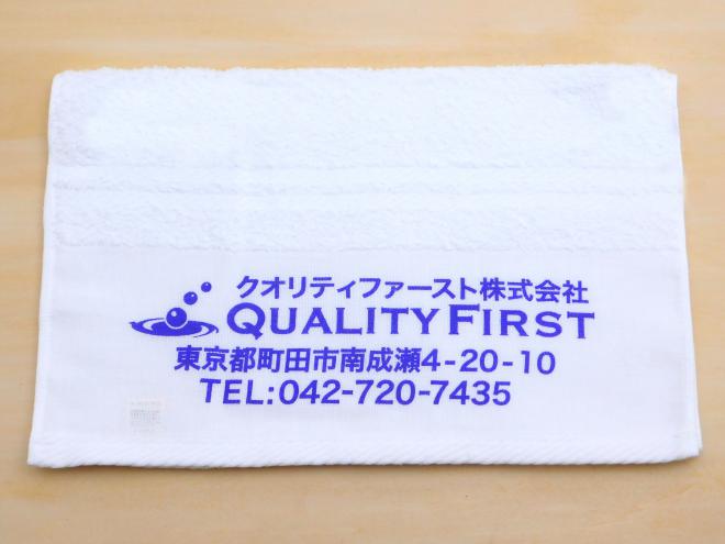 白のフェイスタオルを生地として使用した、名入れタオルです。大人気のネイビーで名入れ印刷させていただきました!大阪泉州産の高品質タオルなので使い心地が最高です!