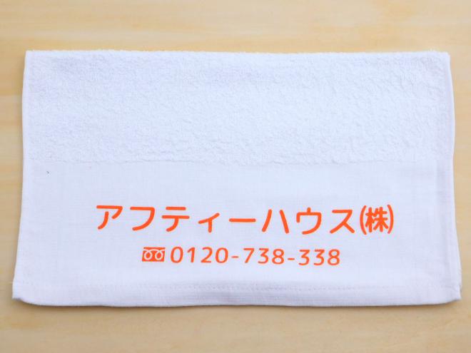 白のフェイスタオルを生地として使用した、名入れタオルです。印刷色のオレンジは、どことなく弾むような楽しさもイメージさせてくれますね!他の色との相性もよく、比較的使い易い色です。