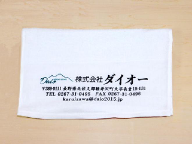 白のフェイスタオルを生地として使用した、名入れタオルです。今回、ロゴと企業情報を別々の色で印刷させていただきました。ブラックのインクでの印刷は生地色を選ばないのが特長です。