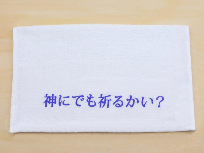 白のフェイスタオルを生地として使用した、名入れタオルです。大人気のネイビーで名入れ印刷させていただきました。