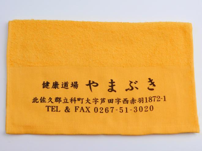 オレンジのフェイスタオルを生地として使用した、名入れタオルです。オレンジは太陽のような温かさをイメージさせる色、他の色とも相性もよく、比較的使い易い色です。ブラックのインクでの印刷は生地色を選ばないのも特長です!